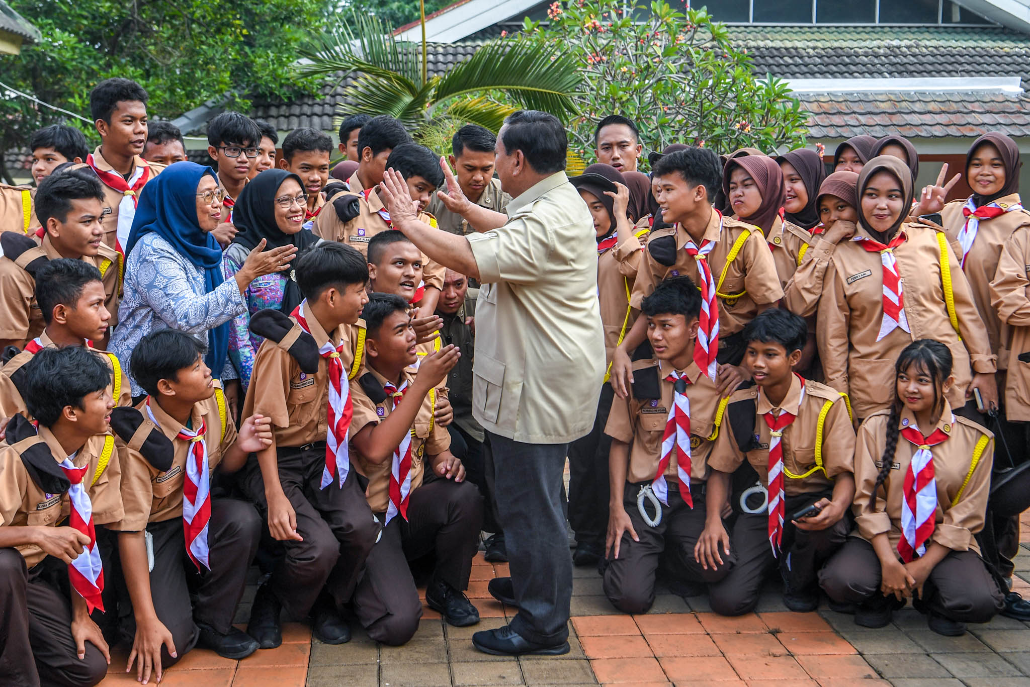 Pada foto, Presiden Prabowo Subianto (tengah) berbincang dengan siswa sekolah rakyat saat meninjau kegiatan belajar mengajar dan fasilitas di Sekolah Rakyat Menengah Atas 10 Margaguna, Jakarta Selatan, Kamis (11/9/2025). ANTARA FOTO/Galih Pradipta