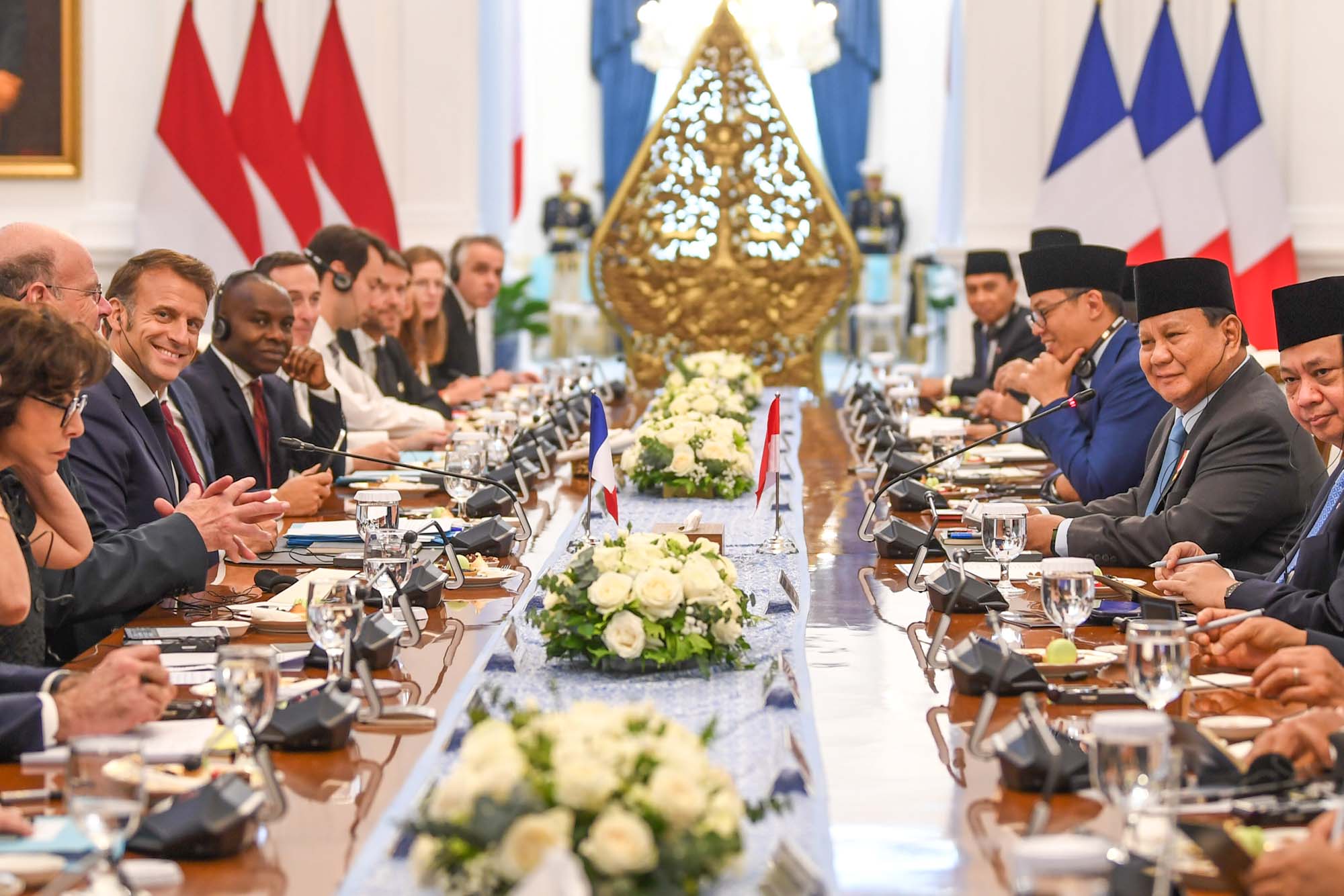 Suasana pertemuan bilateral antara Presiden Prabowo Subianto dan Presiden Prancis Emmanuel Macron beserta jajaran menteri kedua negara berlangsung di Istana Merdeka, Jakarta, Rabu (28/5/2025). Kunjungan kenegaraan Emmanuel Macron di Istana Kepresidenan Jakarta tersebut untuk mempererat dan meningkatkan hubungan bilateral di berbagai bidang strategis antara Indonesia dengan Prancis. ANTARA FOTO/Galih Pradipta