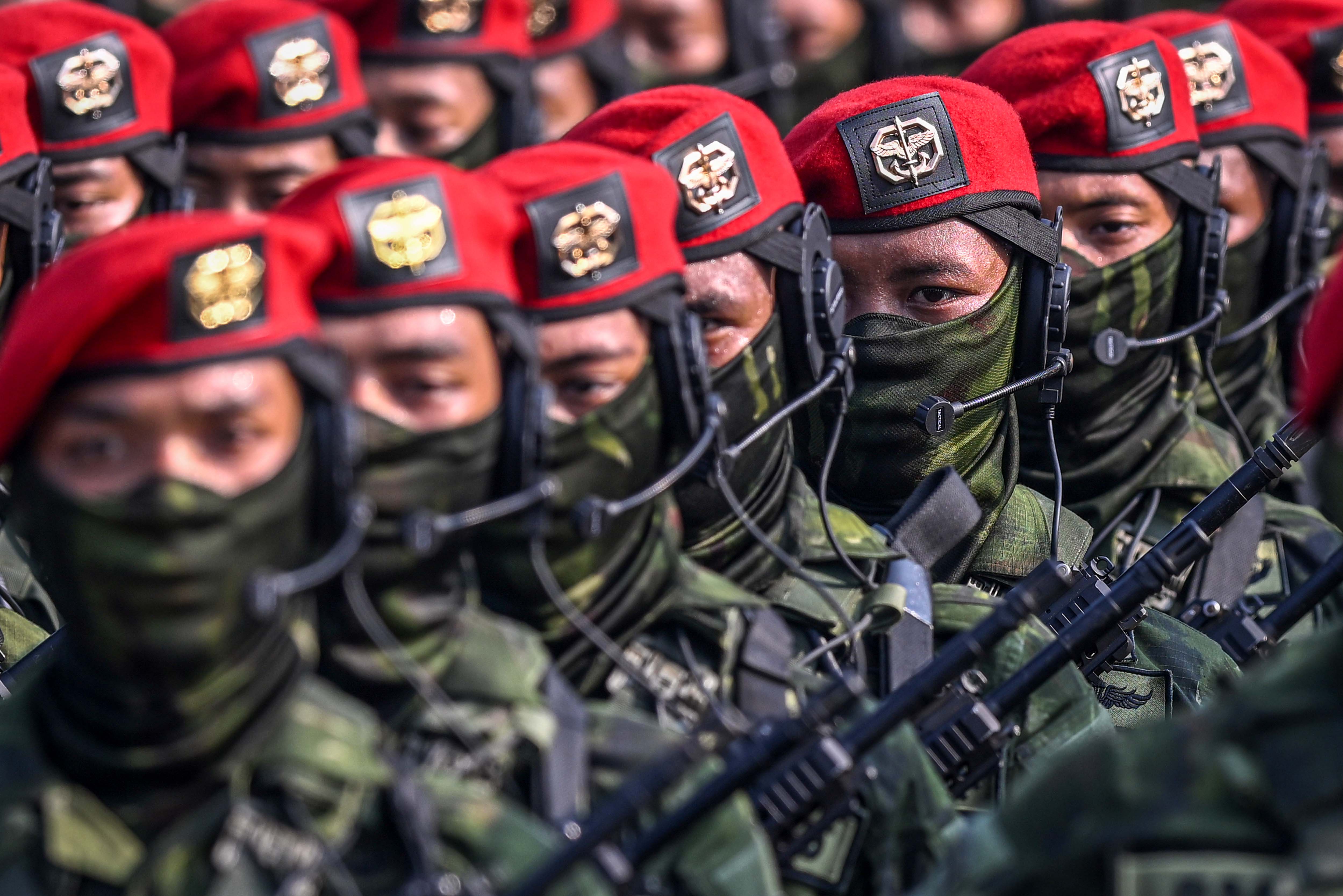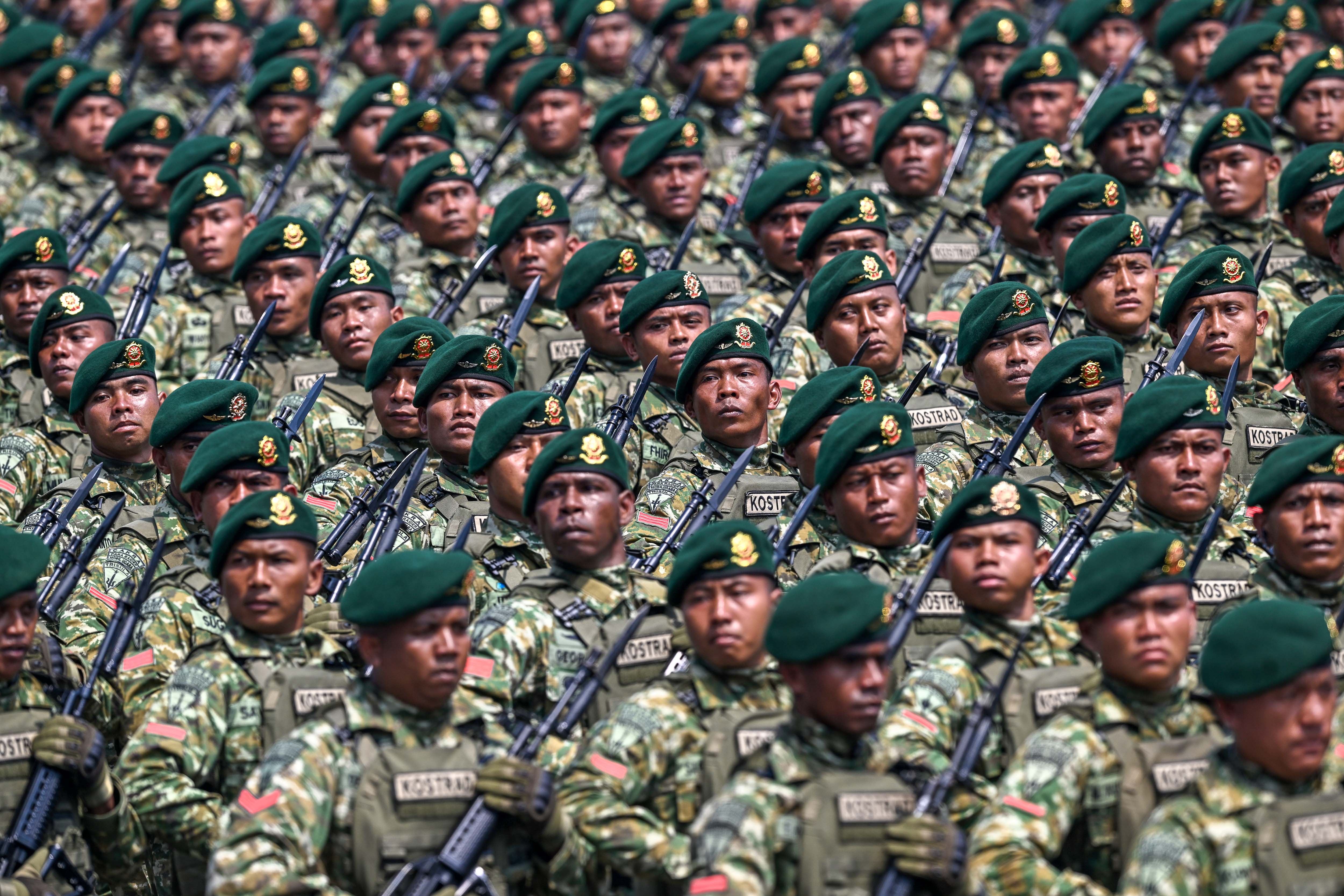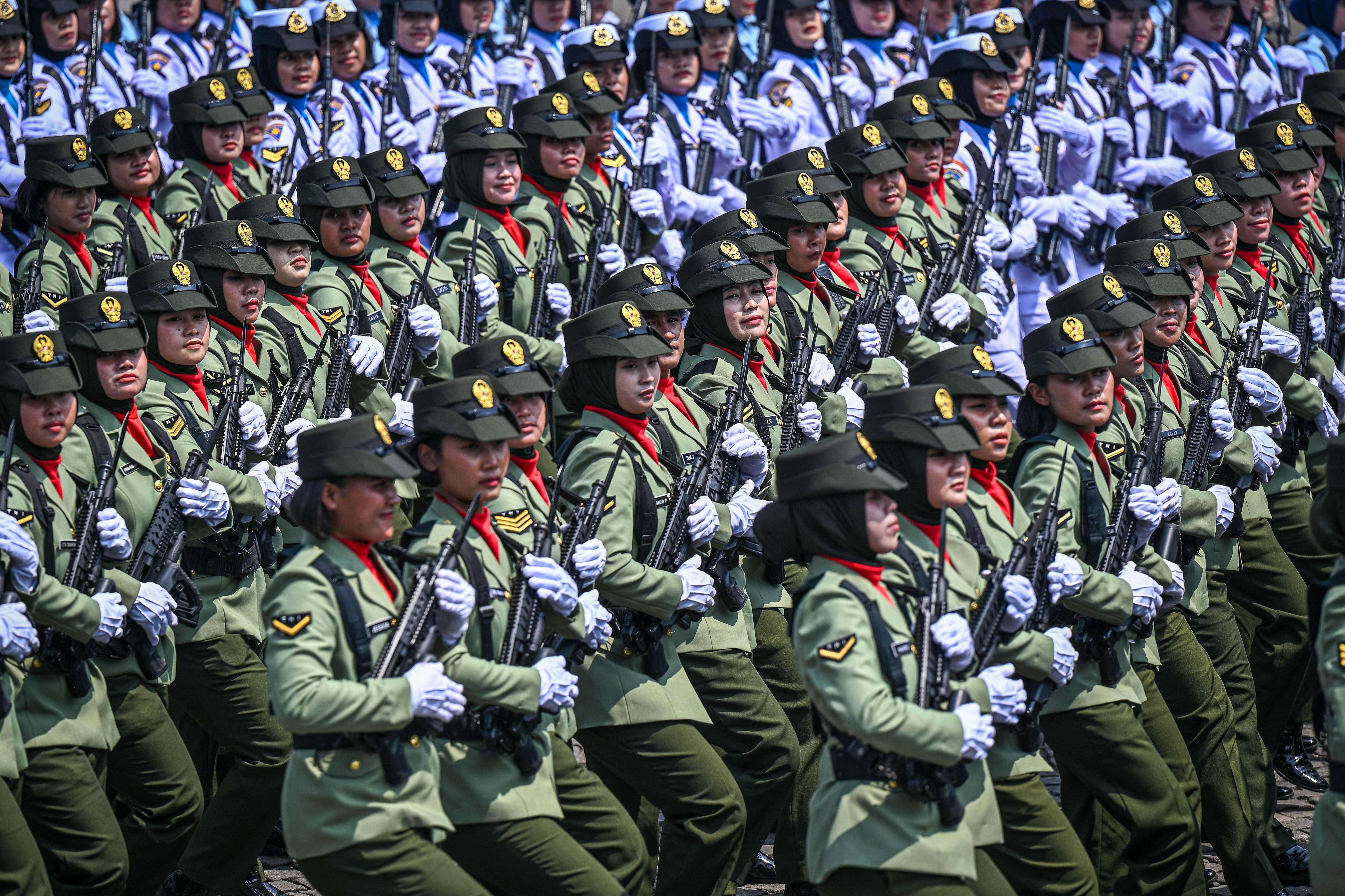 Pada foto, prajurit Korps Wanita TNI berbaris lengkap persenjataan saat mengikuti defile pasukan pada peringatan Hari Ulang Tahun (HUT) ke-80 Tentara Nasional Indonesia (TNI) di Monas, Jakarta, Minggu (5/10/2025). Peringatan HUT ke-80 TNI mengusung tema TNI Prima, TNI Rakyat, Indonesia Maju. ANTARA FOTO/ Fauzan