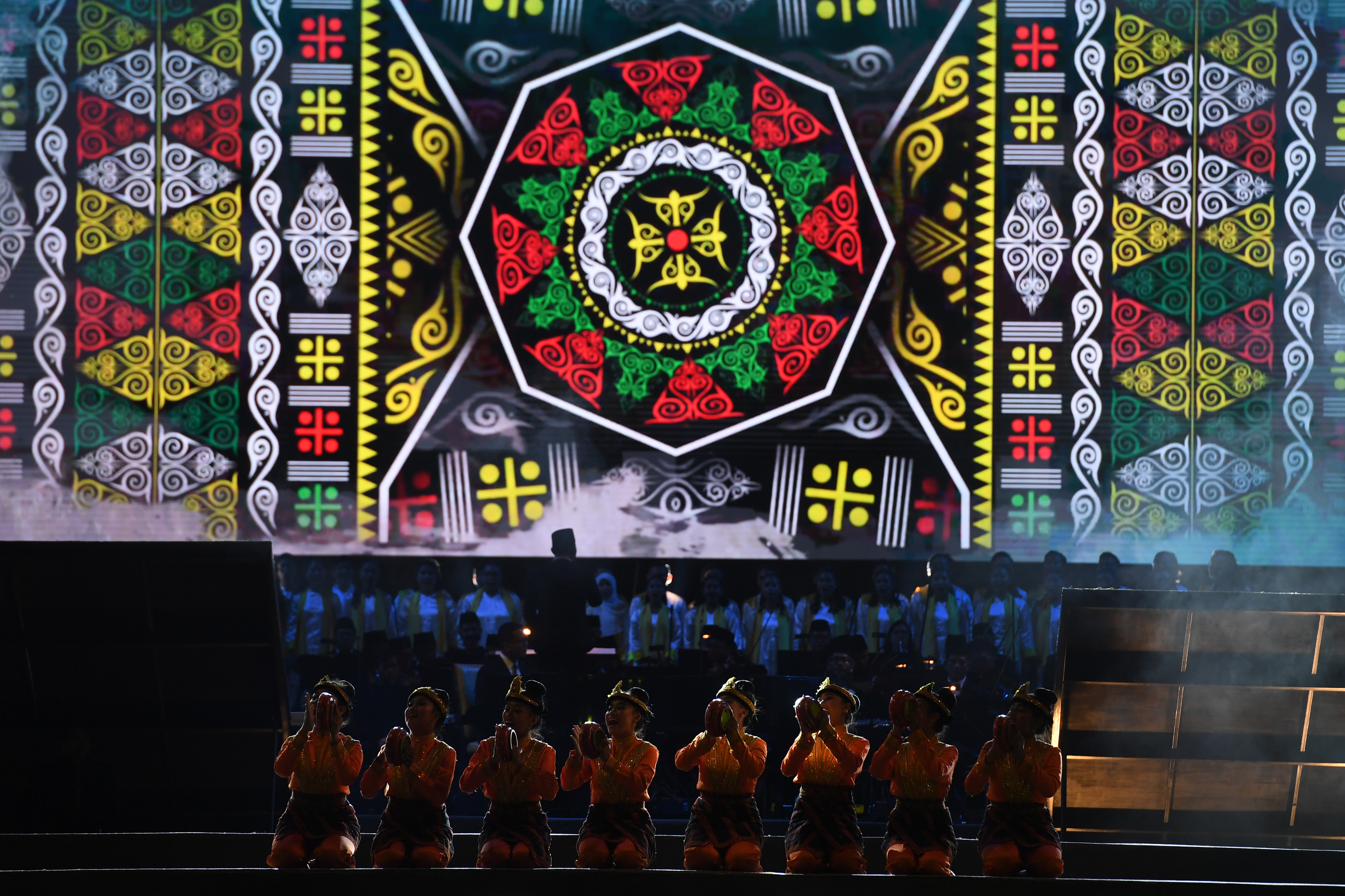 Penari menampilkan tarian Tari Rapai Geleng saat 'Host Country Reception' pertemuan tahunan IMF World Bank Group 2018 di GWK, Bali. Sumber foto: Antara Foto