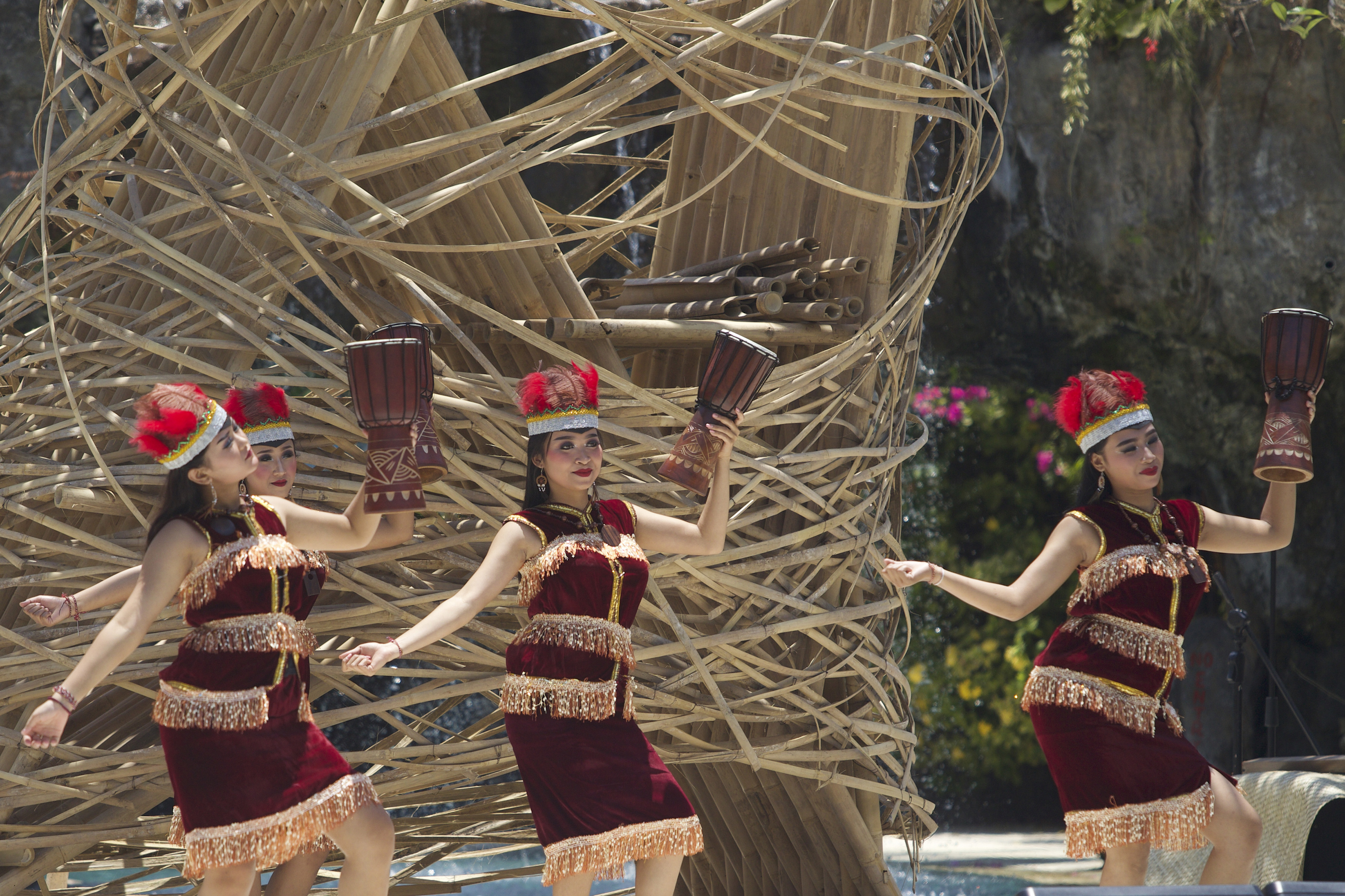 Sejumlah penari dari sanggar Asti Pradnyaswari mementaskan tarian Tifa di Pool Side Westin Hotel Nusa Dua, Bali. Tarian tersebut dipentaskan di sela-sela penutupan rangkaian Pertemuan Tahunan IMF - World Bank Group 2018. Sumber foto: Antara Foto