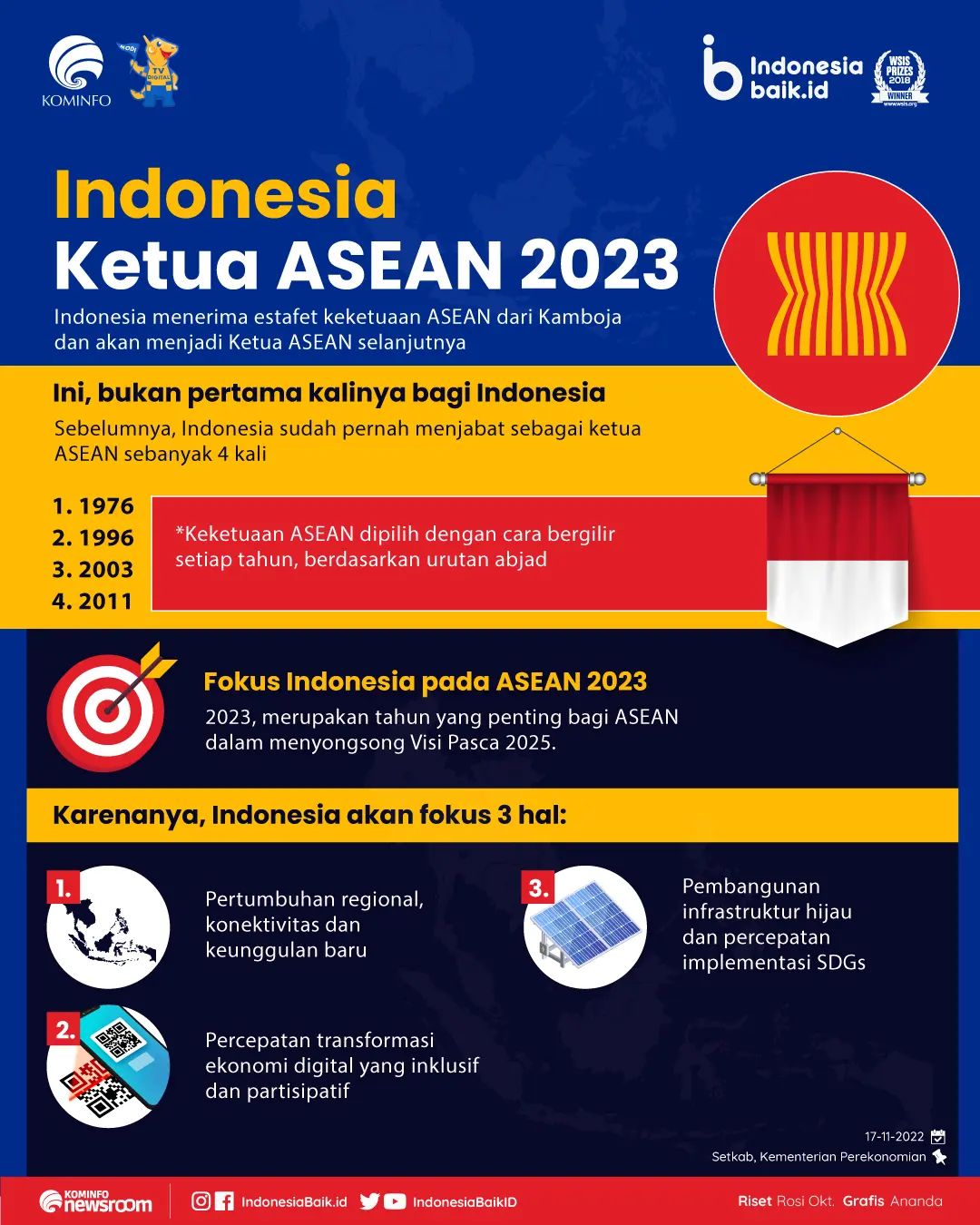 Tahun 2023, merupakan tahun yang penting bagi ASEAN dalam menyongsong Visi Pasca 2025. Karenanya, Indonesia akan fokus 3 hal yaitu pertumbuhan regional, konektivitas dan keunggulan baru; percepatan transformasi ekonomi digital yang inklusif dan partisipatif; serta pembangunan infrastruktur hijau dan percepatan implementasi SDGs.
